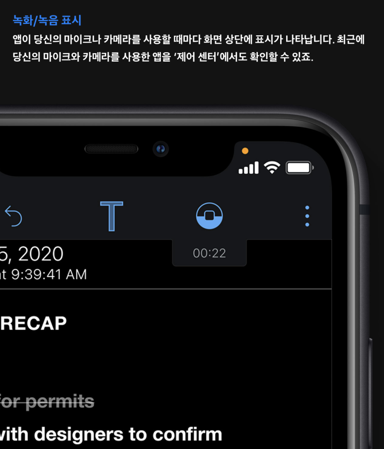 아이폰을 사용중에 캠이나 마이크 녹음을 확인 가능하다